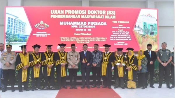“Semoga gelar doktor yang diraih ini menjadi berkah dan bermanfaat, terutama bagi Provinsi Lampung. Disertasinya sangat relevan karena membahas moderasi beragama dan pencegahan radikalisasi serta terorisme,” tuturnya.
