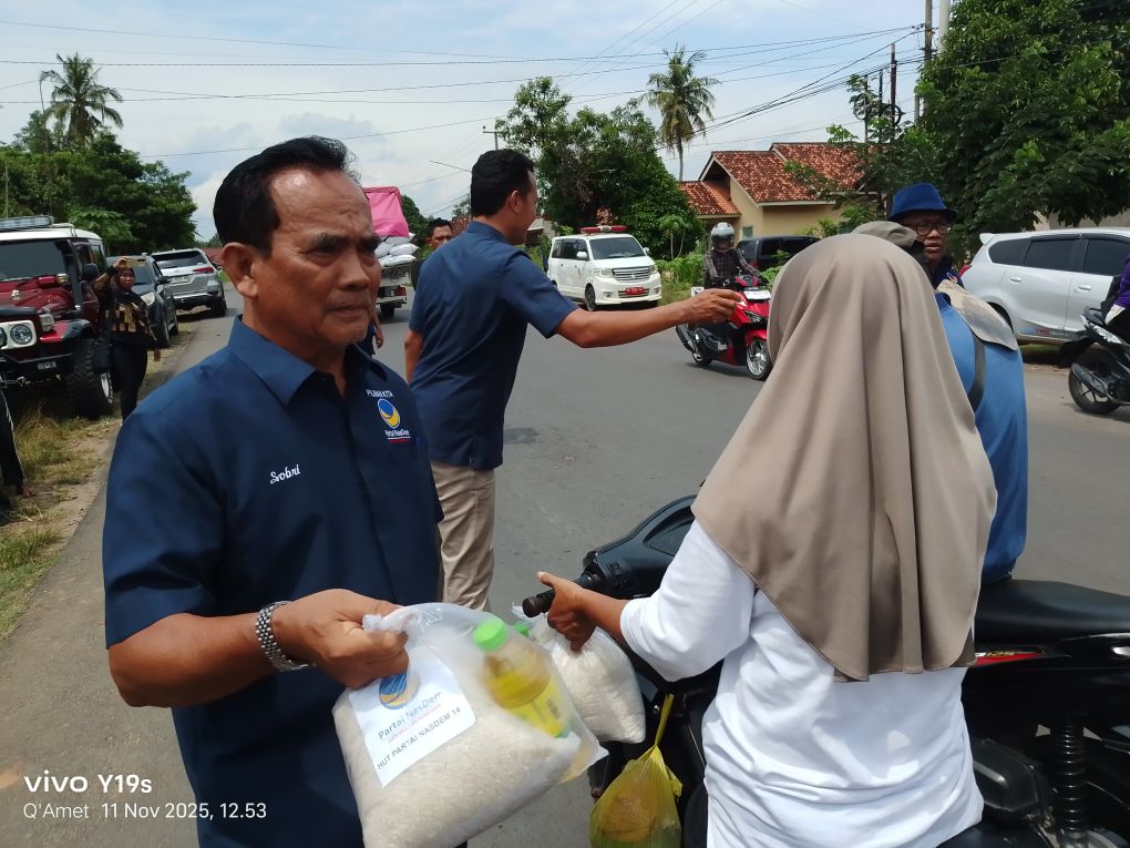 Rangkaian kegiatan HUT ke-14 partai nasdem mengadakan kegiatan pemotongan tumpeng, serta Pembagian ratusan paket sembako, pengobatan gratis, dan melakukan bimbingan teknis (bimtek) kepada seluruh kader partai Nasdem pada Selasa, 11/11/2025.